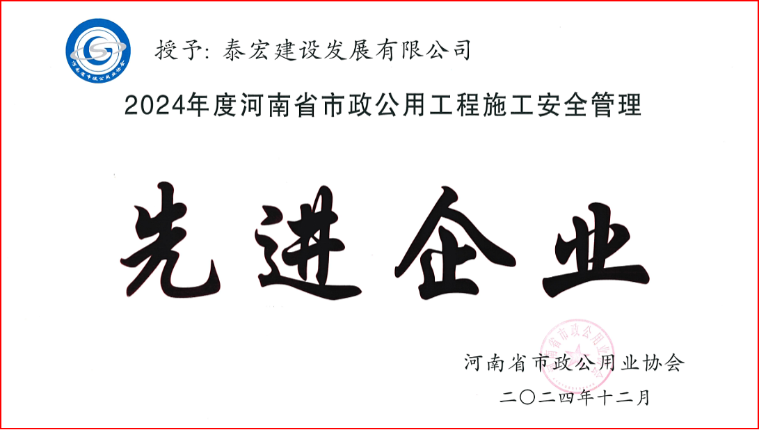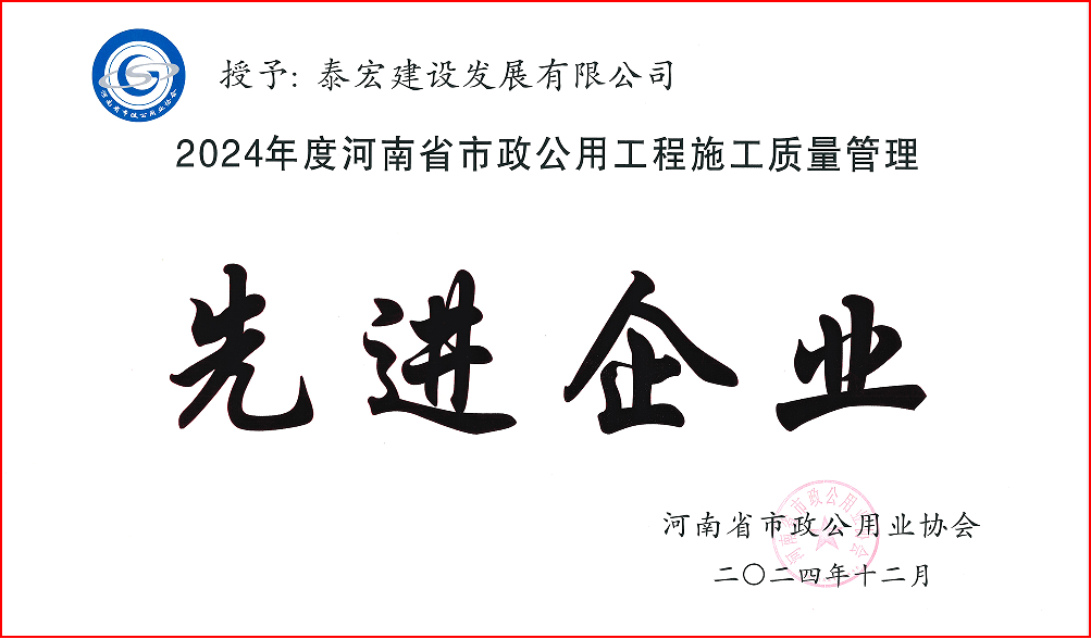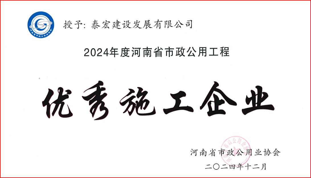 泰宏建设荣获“河南省市政公用工程先进企业”等多项荣誉