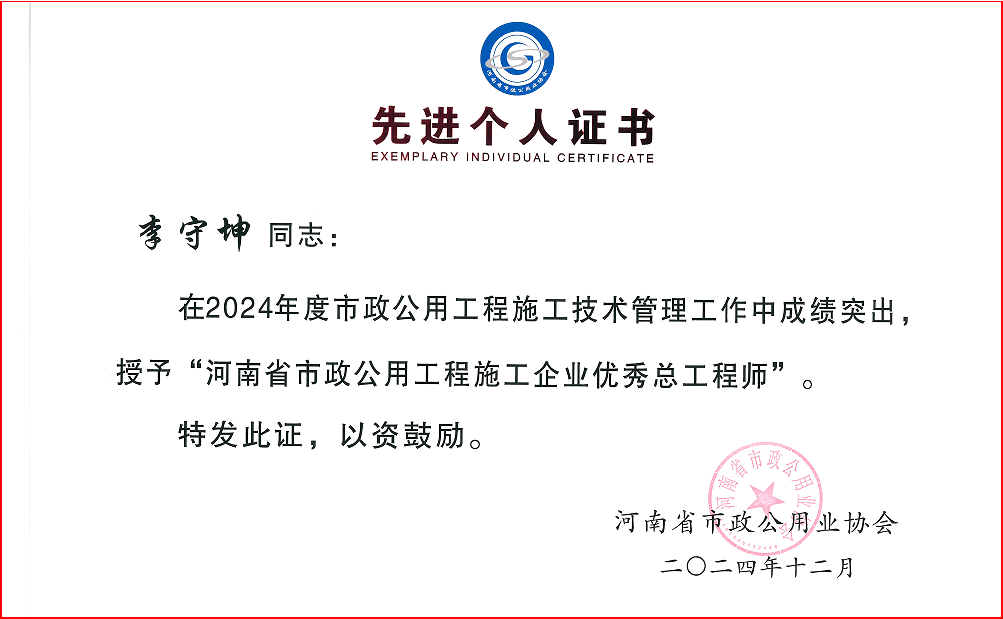 公司总工程师李守坤被授予“2024年度河南省市政公用工程施工企业优秀总工程师”荣誉称号;张东等三位同志荣获“2024年度河南省市政公用工程施工质量管理先进个人”;林坤等两位同志荣获“2024年度河南省市政公用工程施工企业优秀项目经理”;王政凯等三位同志荣获“ 2024年度河南省市政公用工程施工安全管理先进个人”。