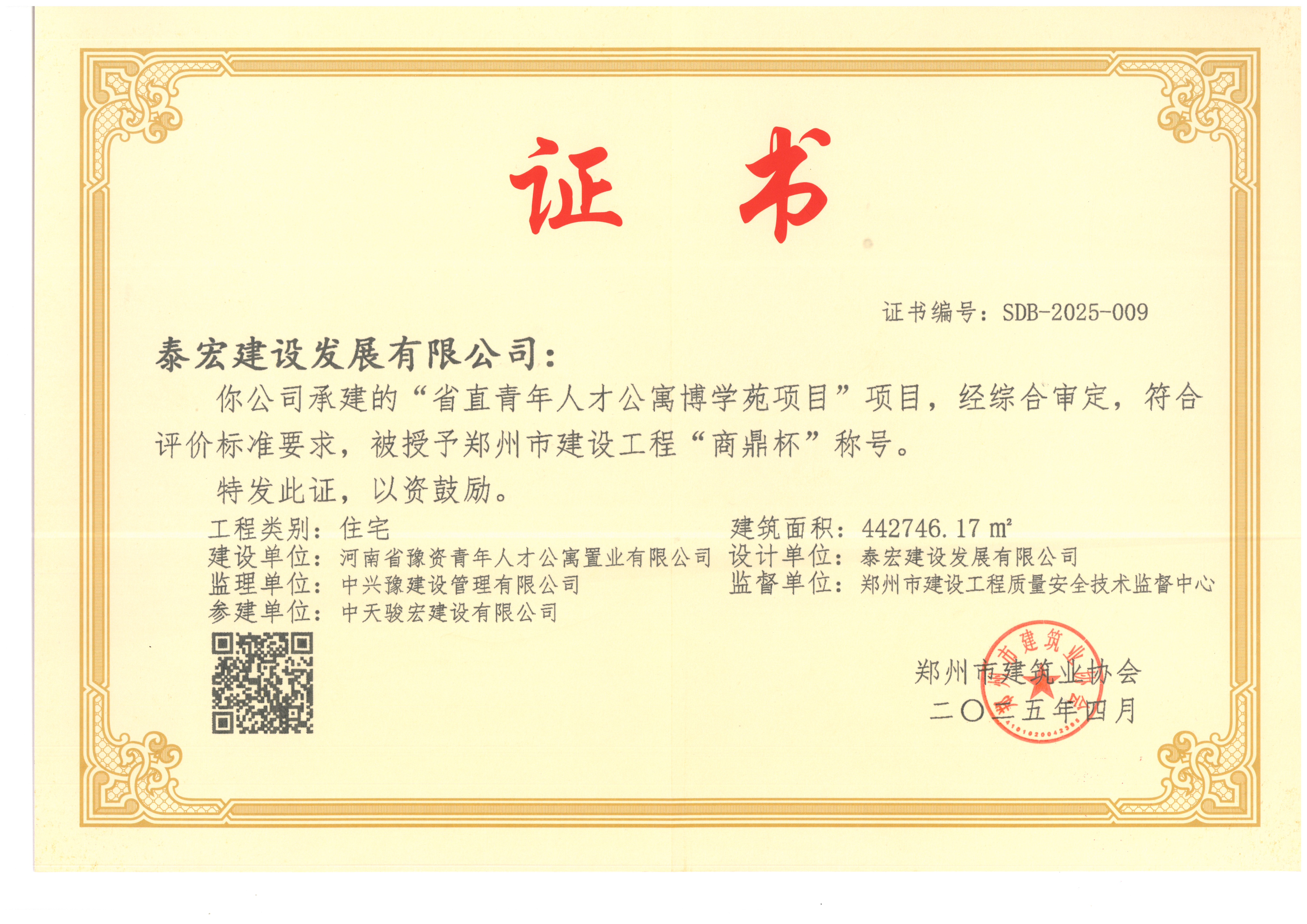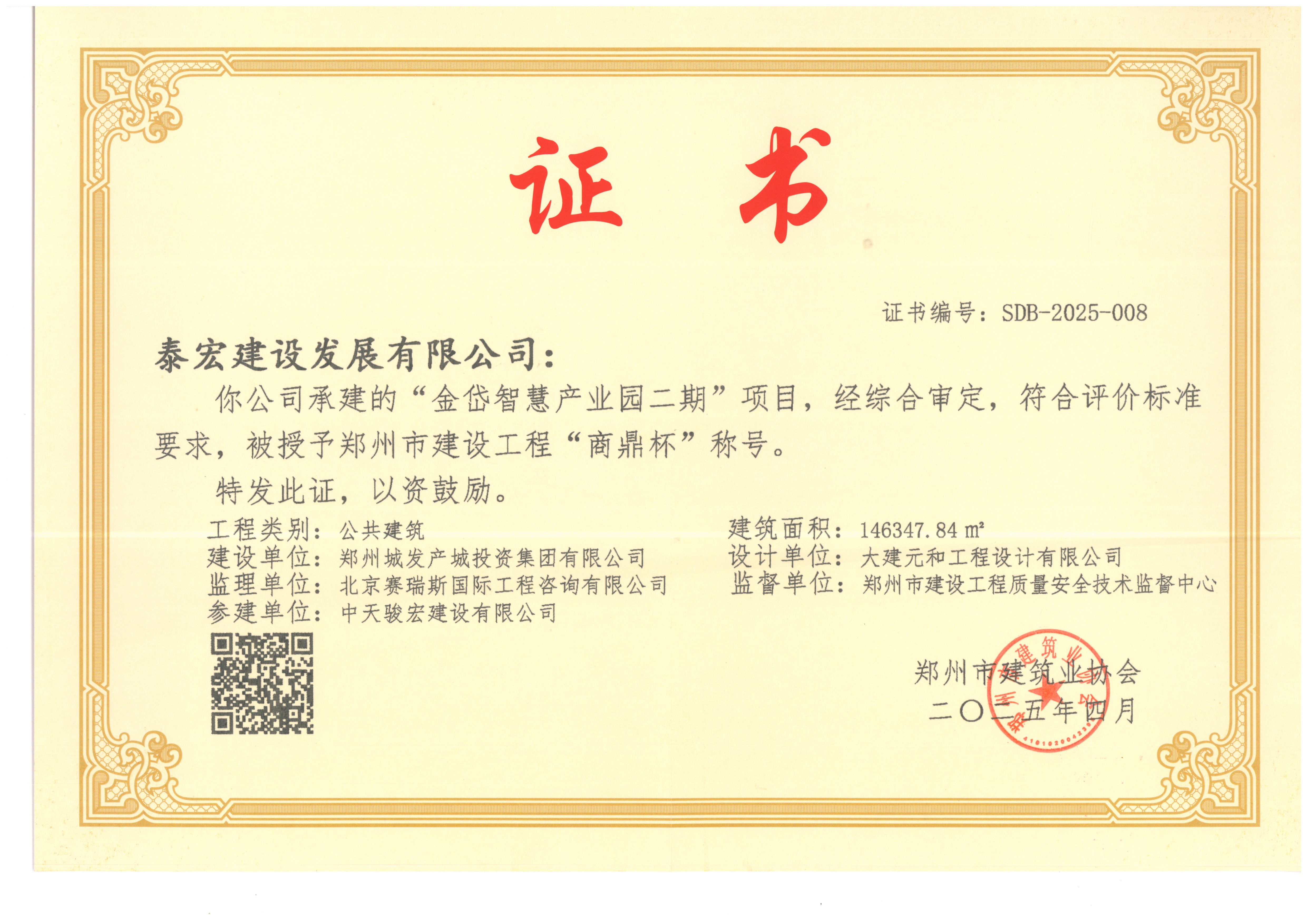 泰宏建设三项省市重点工程荣获郑州市建设工程“商鼎杯”